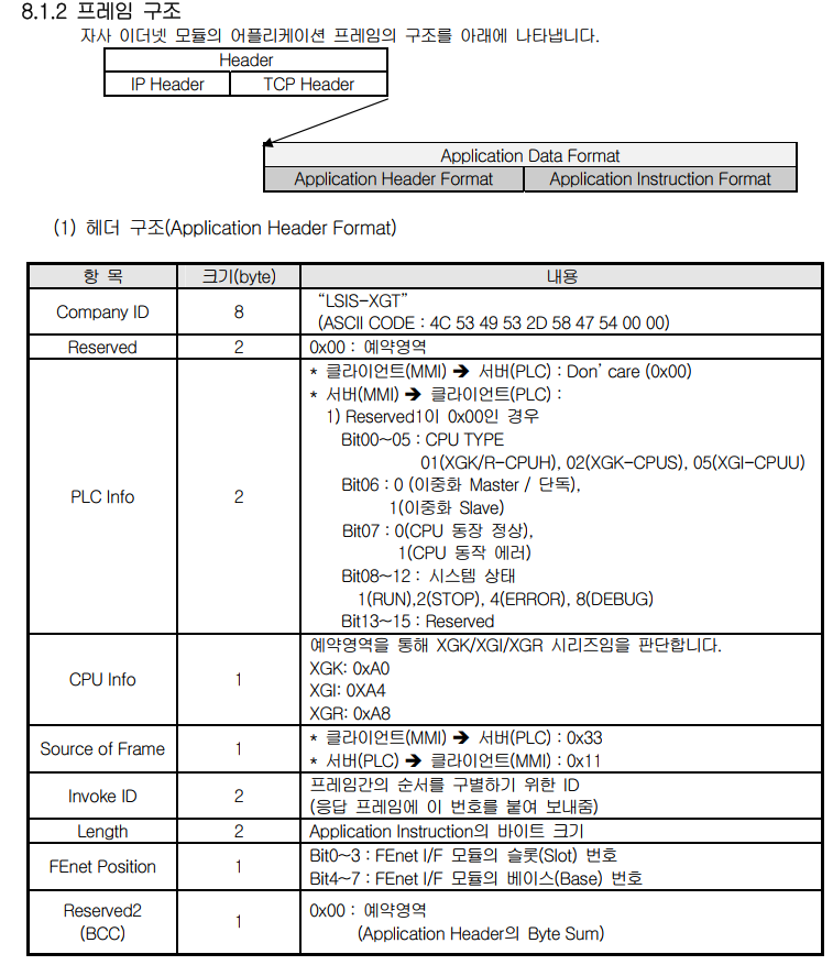 LS PLC와의 통신은 [헤더(Header) + 명령어 프레임(Instruction Frame)]의 결합으로 이루어집니다.