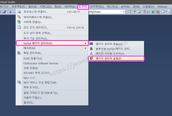 [ 도구 ] > [ NuGet 패키지 관리자(N) ] > [패키지 관리자 설정(P) ]을 선택하여 패키지 설정 창을 열어 줍니다.