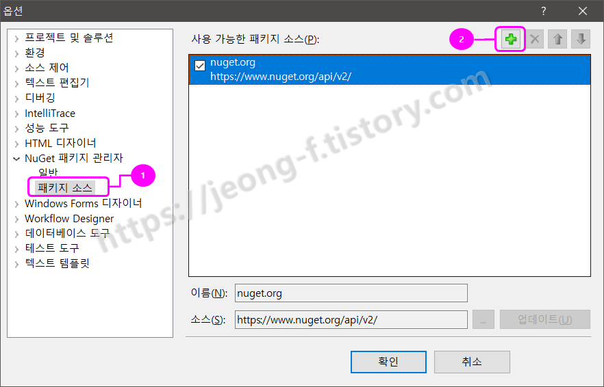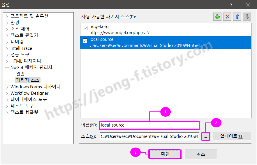 소스는 위에서 지정한 NuGet폴더로 지정한 후 [ 확인 ] 버튼을 눌러 줍니다.