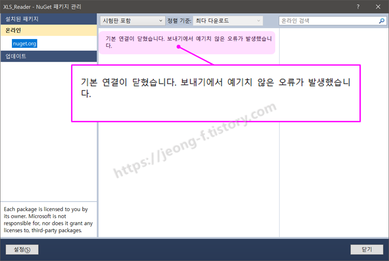 NuGet을 2010에 추가한 후 사용하고자 할 때 " 기본 연결이 닫혔습니다..." 오류가 나타날 경우에 연결 오류 해결을 위해서는 패키지를 재설치하거나 오프라인에서 추가하여야 합니다.